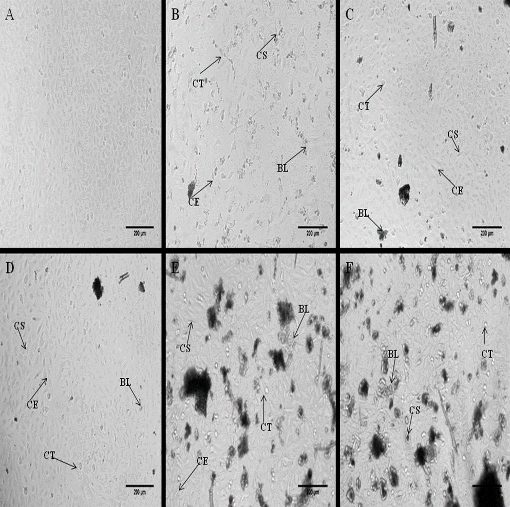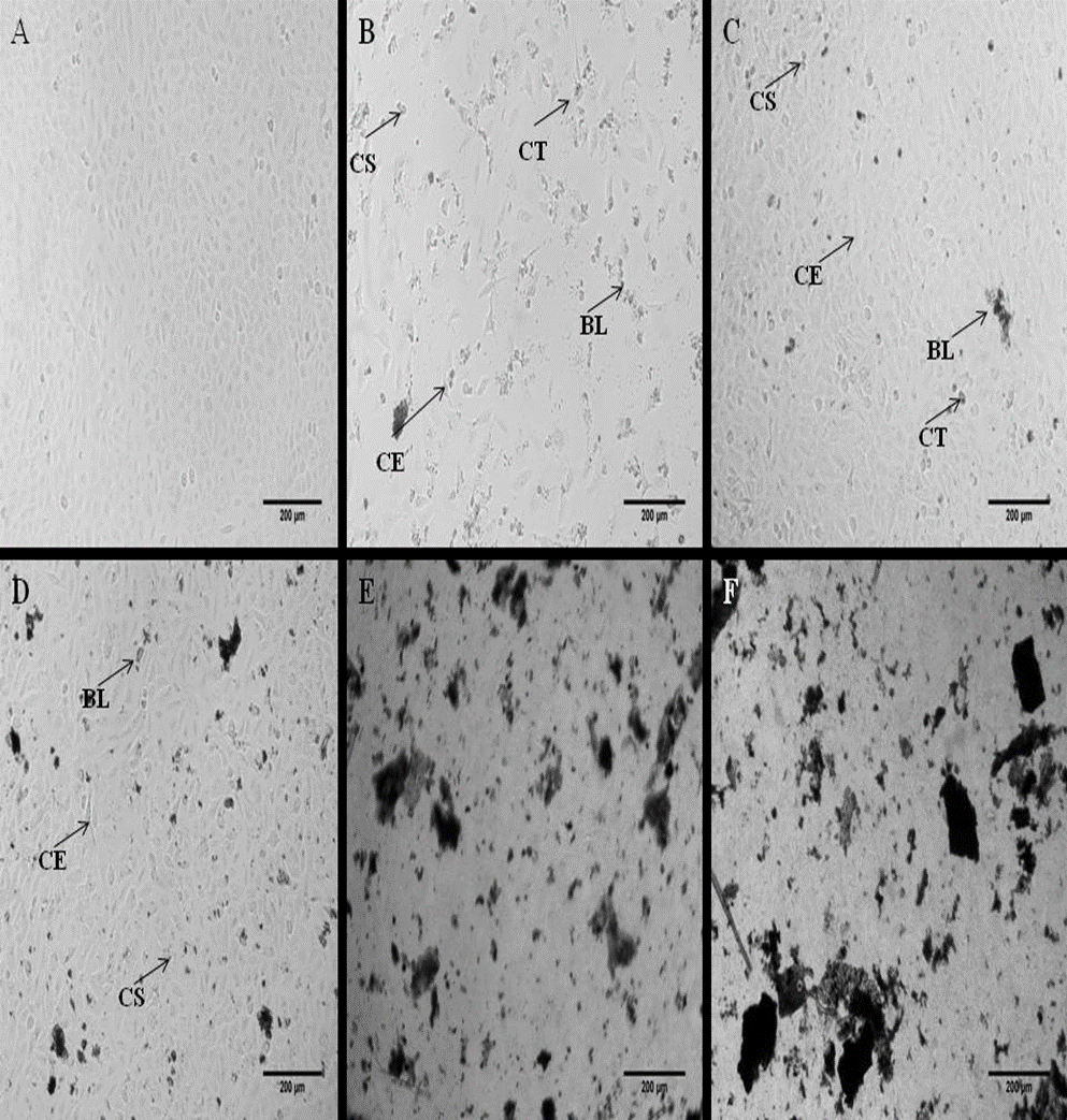Fig. 6: Effect of silver nanoparticles derived from the aqueous leaf extract of Premna intigrifolia on the viability of A549 non-small lung cancer cells, A) Untreated (Control), B) STD (Epotoside 50µM), C) 5µg, D) 10µg, E) 40µg, F) 80µg, CE: Cell expansion, CS: Cell shrinkage, CT: Cell turgidity, BL: Membrane blabbing