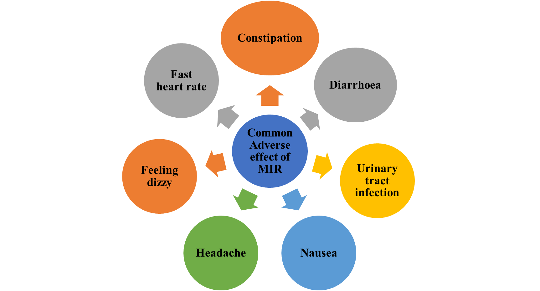 Overactive Bladder (OAB) is an uncomfortable condition described as urine urgency, which has a remarkable effect on routine life performance in both men and women patients [1]. Inadequate sleep and depression are common in OAB, with adverse impacts on physical and mental health. [2]. According to epidemiological studies, in 12% of both adult and female populations, the OAB rate increased from 7 % to 26% with age and time [3]. the main purpose of medication of is OAB to get relief from symptoms without disturbing the empty phase of the micturition cycle [4]. Mirabegron is a clinically beta-3 agonist receptor and is a first-line treatment in OAB. It relaxes the smooth muscles of the urinary Bladder by stimulating beta-3 adrenergic receptors; eventually, it promotes the filling of the Bladder and increases urine storage amount [5, 6]. Mirabegron is considered a first-line therapy because of its higher efficacy in treating OAB with a moderate adherence rate at 6 mo. According to the study, out of 196 patients, 128 received mirabegron monotherapy; urinary urgency was improved in them (P<0.05), and 68.0, 54.4 and 39.4% at 3, 6, and 12 mo respectively was the persistence of monotherapy [7]. It is available in the market since 2013 [8]. Mirabegron is an official drug indicated for OAB in Japan, USA, Canada, and Europe [9]. Mirabegron is used with or without combination with anti-cholinergic drugs such as solifenacin succinate, darifenacin, and fesoterodine to treat urinary incontinence [10]. This review focuses on analytical methods such as Ultraviolet (UV) spectroscopy, Spectrofluorimetry, Thin-layer chromatography, High Performance-Thin Layer Chromatography, High-Performance Liquid Chromatography, High-Performance Liquid Chromatography-Mass spectrometry/Mass Spectrometry, Ultra HPLC-Mass Spectrometry/Mass Spectrometry and Capillary electrophoresis are used for estimation of quantity and quality of mirabegron present in the formulation and biological sample in last 20 y. Some adverse effects of MIR are shown in fig. 2. Analytical method-wise distribution of mirabegron in the public domain is shown in fig. 3.