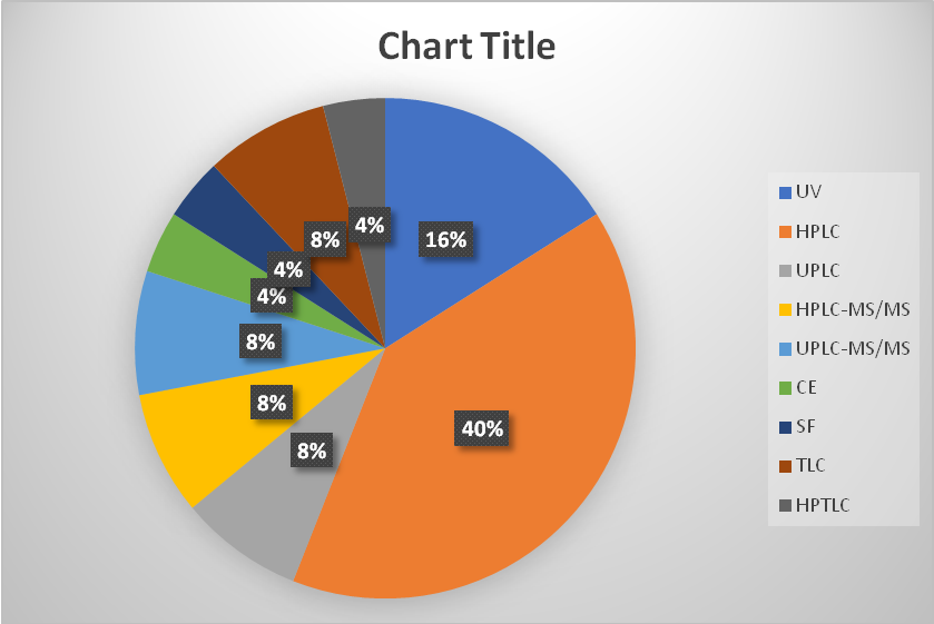 Fig. 3: Overview of analytical methods described in the literature for Mirabegron determination. UV: Ultraviolet spectroscopy; CE: Capillary Electrophoresis; SF: Spectrofluorimetry; HPLC: High-performance liquid chromatography; LC-MS: Liquid chromatography-mass spectrometry; LC-MS/MS: Liquid chromatography-tandem mass spectrometry; UPLC: Ultra performance liquid chromatography; UPLC-MS/MS: Ultra performance liquid chromatography-tandem mass spectrometry; TLC: Thin Layer Chromatography; HPTLC: High-Performance Thin layer chromatography [11]