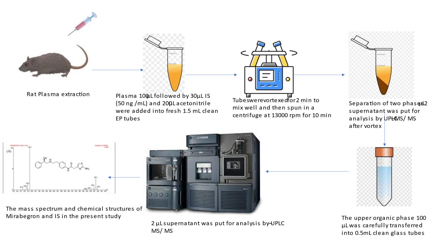 When UPLC is coupled with a mass spectrometer (MS), a novel technique UPLC-MS forms with good resolution power. It combines the separation feature of UPLC and mass determination of Mass spectrometry. It has greater precision, accuracy, and sensitivity [28]. Author [29] proposed mirabegron determination in rat plasma after oral and intravenous administration by UPLC-MS/MS method. The sample was extracted using a protein precipitation method and acetonitrile was used as a solvent for precipitation. The molecule appears in a chromatogram at 2.5 min using a UPLC BEH C18 column (2.1 mm × 50 mm, 1.7 μm) with a mixture of acetonitrile water used as a mobile phase at a flow rate of 0.35 ml/min. Deproteinization was done using acetonitrile. Peak of protonated mirabegron and tolterodine was obtained at m/z 397.34 and 326.47, respectively, using electrospray ionization positive ion mode. The linearity of the drug in rat plasma was found linear over the range of 5-2500 ng/ml (r2=0.999). Forced degradation of mirabegron in rat plasma was found in the ideal range of 5-2500ng/ml. Sample preparation procedure that is schematically shown in fig. 5. Male Sprague-Dawley rats were used in ten no. for pharmacokinetic study by administering the drug via oral and intravenous routes and UPLC-MS/MS method validated. The Limit of Quantification for the drug in rat plasma was achieved 5ng/ml.