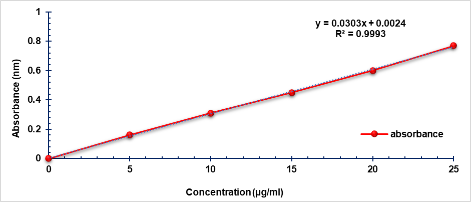 Calibration curves of TG in DMSO solutions were constructed by preparing serial dilutions of TG with different concentrations of 5-25 µg/ml from a concentration that is stored as a stock solution of 1000 µg/ml. Samples were analysed spectrophotometrically at the wavelength of maximum absorbance of TG. The measured absorbances were recorded and plotted versus the respective concentrations [11].