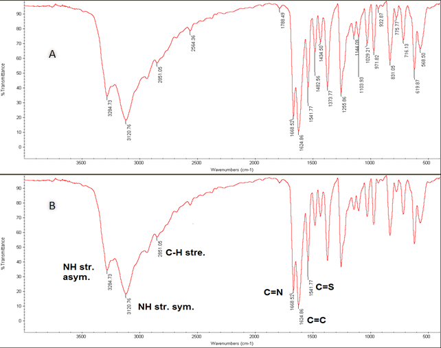 As shown in fig. 5B, the absorption bands observed for pure TG exhibited the distinctive characteristics of pure TG. These included peaks at 3285 in addition to 3121 cm−1; it was by the stretching of the amine group in both asymmetric and symmetric directions. Additionally, absorption bands were observed at 1669 and 1625 cm−1, indicating the presence of C=N and C=C bonds, respectively. Furthermore, a peak at about 1541 cm−1 was observed, indicating the presence of C=S stretching groups within the TG range. The bands observed at wavenumbers of around 3284 and 3120 cm−1 correspond to the vibrational modes associated with the asymmetrical, symmetrical, and stretching motions of the NH bonds, respectively. The TG-FTIR spectrum was corroborated by all the other bands.