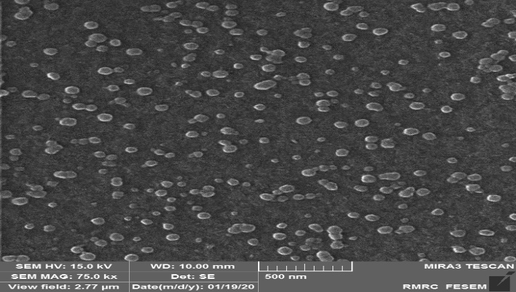 NLCs are classified depending on their size, form, and loading capacity. In this work, NLCs were generated using the previously reported approach [29], and FSEM was used to establish their size and shape. The cellular absorption of NLCs is greatly influenced by particle size and shape [30]; as a result, spherical forms are the best options for efficiently eliminating cancer cells [31]. Smaller sizes are thought to be less toxic [30].