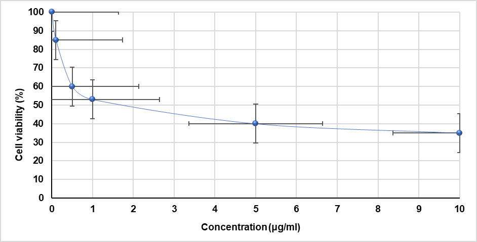 The current investigation sought to investigate the cytotoxic impacts of three distinct concentrations of the substance. (1, 2, and 5 µg/ml) of both free drugs and manufactured drugs on MCF-7 cells. The cytotoxicity was assessed using the MTT test. The control cells were cultivated concurrently in a standard medium, specifically, Dulbecco's Modified Eagle Medium (DMEM) supplemented with 1% antibiotic penicillin/streptomycin, for 72 h. In addition, the biocompatibility of the drug carrier was evaluated through the treatment of cells with a polymer devoid of any medication [23].