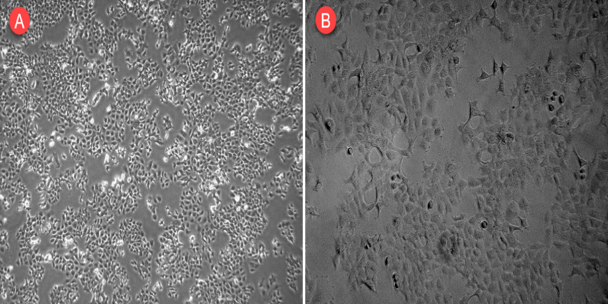 Fig. 9: Exhibits the morphological properties of MCF-7 cells, with the magnification of the A and B images being ×4 and ×10, respectively