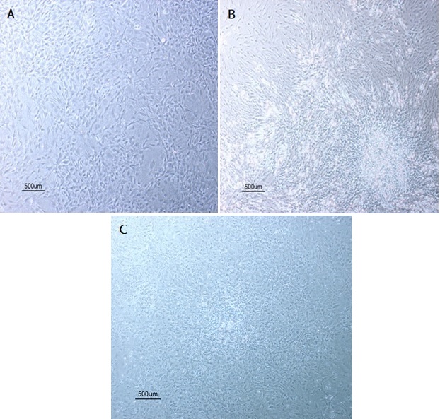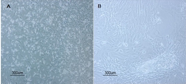 Fig. 1: Phase contrast images of rBMSCs at P0 (A) and P3 (B) were shown (×100). The cells appeared flat morphology, and the blood cells were removed with increasing passage number