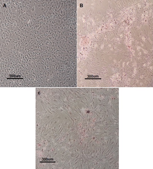 Fig. 2: Alizarin red staining after 14 d of treatment in experimental groups. A: Undifferentiated cells of the negative control group; B: Positive control group; C: EMF group