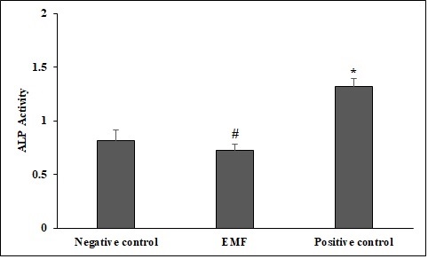 Fig. 4: Alkaline phosphatase activity in negative control, EMF, and positive control groups after 14 d of treatment. *significant increase versus negative control, # significant decrease versus positive control. Values are mean±SD n=3