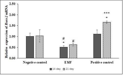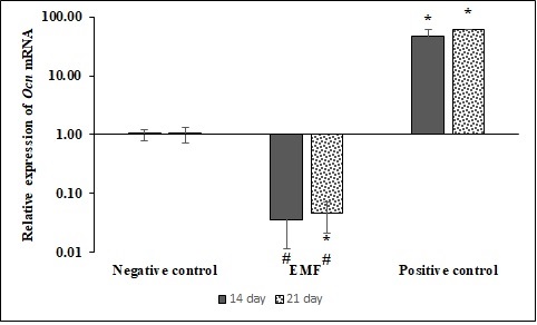 Ocn gene expression reduced dramatically in the EMF group after 14 d of treatment compared to the positive control following 21 d of treatment compared to the negative and positive controls. These results are consistent with the results of Junsen et al. (2010), who reported that exposure to BMSCs at a frequency of 15 Hz, the intensity of 0.1 mT for 14 d, reduces the expression of Runx2 and Ocn genes [15] and Liu et al. (2014) stated decreased Runx2 and Ocn genes expression in BMSCs exposed to EMF with a frequency of 50 Hz and an intensity of 1 mT for 2 h/day for up to 14 d [36].