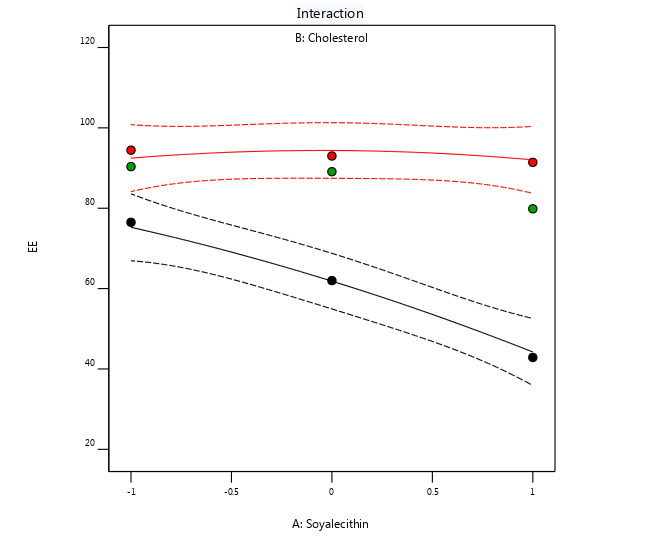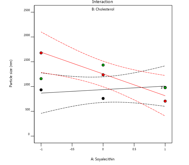 Response parameters based on the outcomes of the forecast profiler, the values for cholesterol and soy lecithin have been set at low 706.1 and high 1433.6, respectively. Cholesterol and soy lecithin are combined in a 2:1 ratio for the run that results in the lowest vesicle size. The interaction graph shows that the independent variables (A and B) interact strongly. In ANOVA table 3, the model's f-value of 5.619 suggests that it is significant. P-values for significant model variables are 0.0468 or below or less than 0.0500. The significance of the model term AB in this circumstance is therefore established, as well as the relationship between independent variables and the response (particle size) (fig. 3).