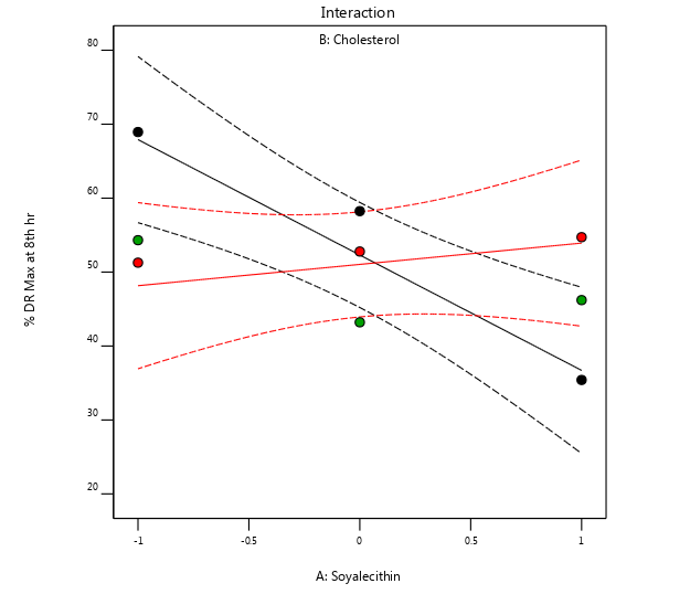 According to the interaction graph, the significant interactions between Span 60 (A) and Cholesterol (B) account for the major response disparities. When viewed as response contours (two elements at once), the contour lines represent lines of equal response (fig. 4).