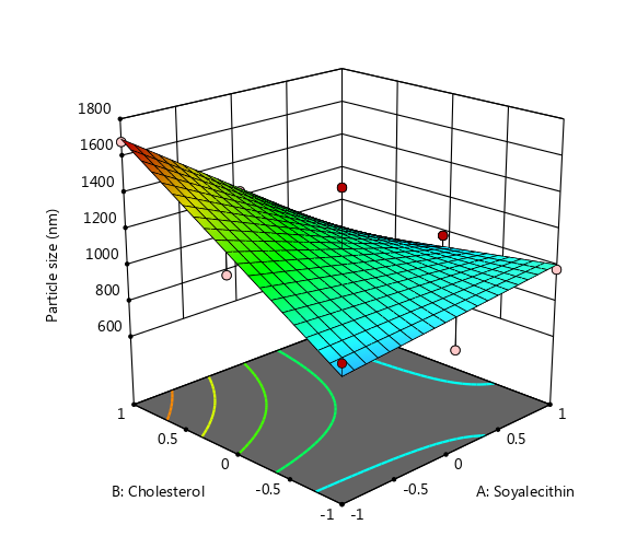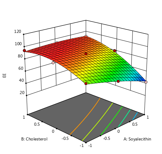 The 32 full factorial design offered 9 runs for two independent variables, soy lecithin and cholesterol, each at three different levels (high, medium, and low), in the experimental design. The results of the ANOVA are shown in tables 10, 11, and 12, and they show that each model was significant (p 0.05) overall. Non-significant terms (p>0.05) were removed from equations to simplify models, resulting in: