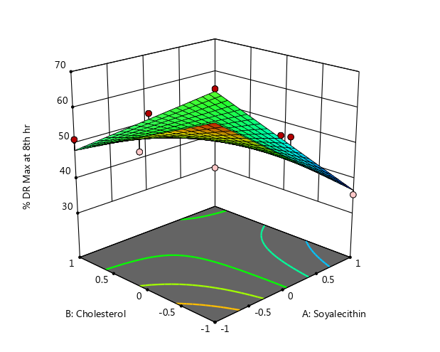 % Drug Release Maximum at 8th hour =+49.16667-6.53000* (A)+4.56667*(B)