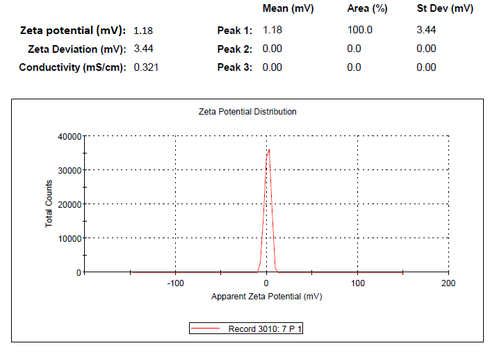 The repulsion or attraction of charges between particles is quantified by the zeta potential. A Zeta potential analyzer (DTS Version 5.03, Malvern) was used to find the zeta potential at 25 °C. The mean zeta potential and electrophoretic mobility values were acquired directly from the measurement.
