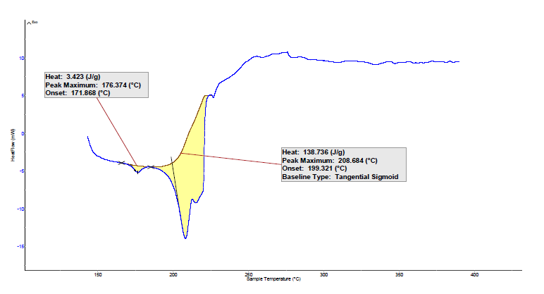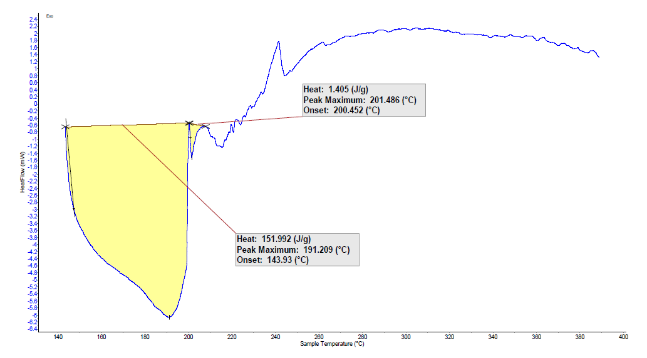 Using a differential scanning calorimeter, terbinafine differential scanning calorimetric studies were conducted (Perkin Elmer). In the sample and control compartments of the furnace, 10 mg of the sample was added to an aluminium pan. Samples were heated to 400 °C while being continuously flushed with nitrogen gas at a rate of 5 °C/min and flow rate of 50 ml/min.