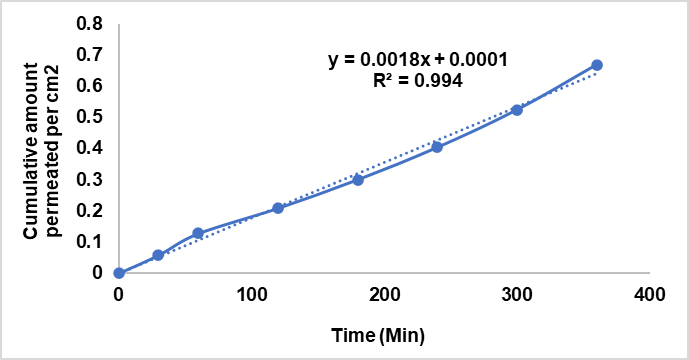 The total amount of medication absorbed over the duration of 1 to 8 hours is displayed in the table 10. The flux as well as the permeability coefficient of the samples is given in table 11. It was discovered that the flux Jss for the gel was 0.0018 (mg/cm2/min). The enhanced gel's permeability coefficient was discovered to be 0.0009 cm2/min. It was discovered that the formulation had higher flux and permeability coefficients, showing that ethosome gel with Carbopol had increased drug release and permeability coefficient [39, 40].