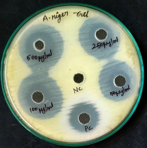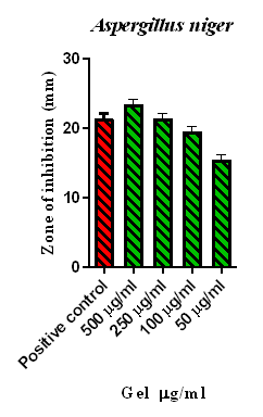 | Aspergillus niger | Gel | 23.5±0.7 | 21.5±0.7 | 19.5±0.7 | 15.5±0.7 | 21.5±0.7 | |