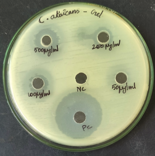 | 500 µg/ml | 250 µg/ml | 100 µg/ml | 50 µg/ml | Positive control (10-20μg/ml) | |||