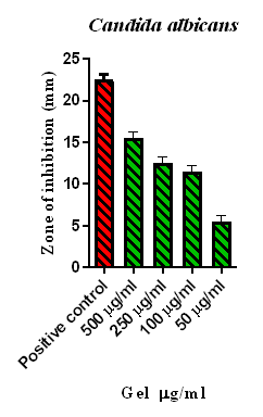 Table 12: Mean zone of inhibition obtained by sample gel against Candida albicans and Aspergillus niger