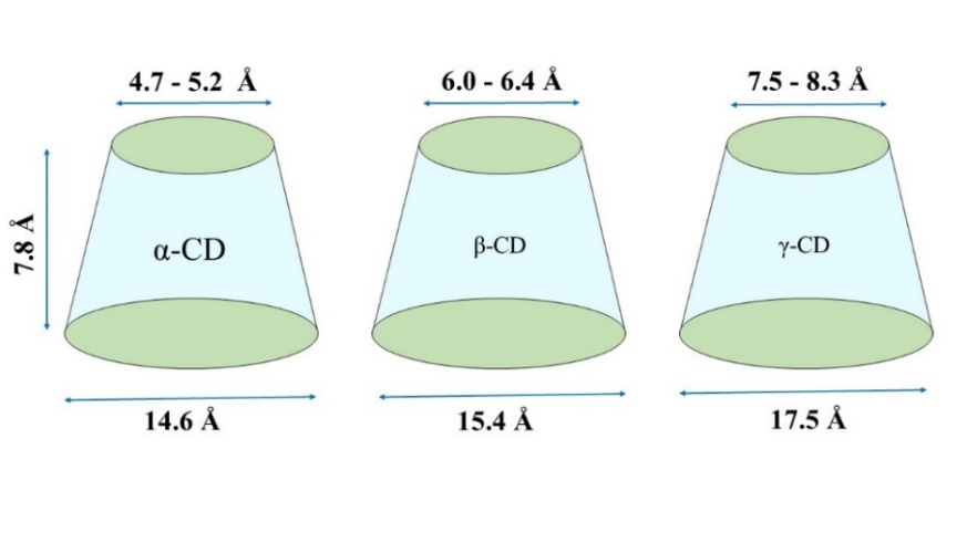 Fig. 4: Dimensions of different CDs α-CD, β-CD, and γ-CD (height, inner cavity diameter, outer diameter)
