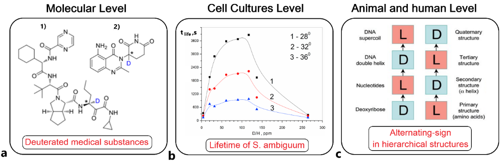 Fig. 1: Types of chiral switches on different hierarchical structures of the human organism. a–molecular level exchange protium by deuteriumind1-telaprevir (1) and d1-CC-122 (analog of Thalidomid (2); b–area of homeostasis of a biological object depending on the deuterium/protium) ratio; c–dynamic helical chirality (Tverdislov's law)