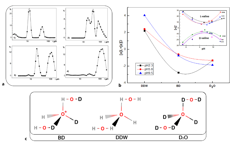 Fig. 2: Valine optical isomers in aqueous solutions with varying isotopic compositions, a-dimensional spectra of giant heterogeneous clusters (GHCs) of water in deuterium-depleted water (DDW) solution of D-valine at pH 2.3–1), pH 6.3–2), L-valine at pH 2.3–3), andpH 6.6–4). b–the total values of the specific rotation of 4% valine stereoisomer solutions at pH 2.3, pH 5.8, and pH 9.5 (BD: D/H=140 ppm; DDW: D/H=4 ppm; D2O: 99.9% D2O). Insert-the initial results for F(pH); n=5, mean±SD. c-represents the theoretical prediction of chiral center formation in waters with different D/H ratios (hypothetical model)