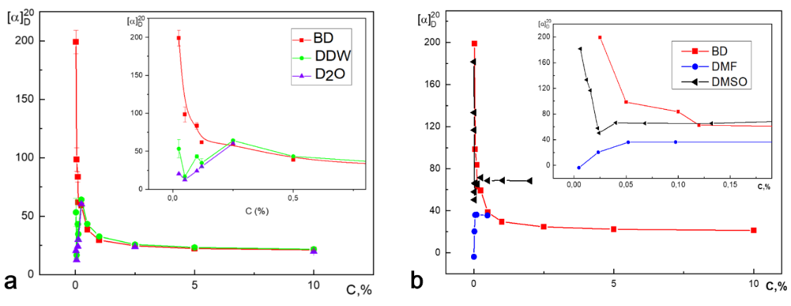 According to Biot's law, the specific rotation of solutions of optically active substances at a selected temperature (T) and wavelength (λ) does not depend on the concentration (C). However, in quantum-mechanical calculations, it has been shown that in some cases, this relationship may be violated [21]. In the non-linear function describing the specific optical rotation for 0.03-4 mol/l solutions of D-levoglucosan, the authors explain the presence of heterogeneous water structures, which increase in size upon dilution. The combined impact of optically active substances and solvent associates has been termed "solvent imprinting" (or sergeants-and-soldiers-type), referring to the influence of supramolecular structures on the specific optical rotation value. There is also evidence that the water surrounding biomolecules also exhibits chirality [22].