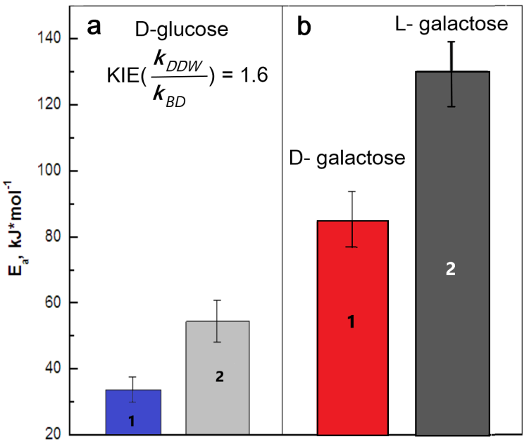 Fig. 4: Activation energy (Ea) of monosaccharide mutarotation (n=3, mean±SD): a–D-glucose in BD (1) and DDW (2) solutions. D/H: BD–140 ppm, DDW–4 ppm; b–D-galactose (1) and L-galactose (2) in DDW