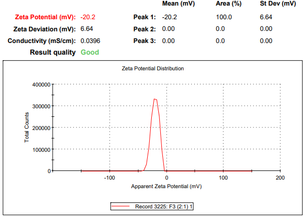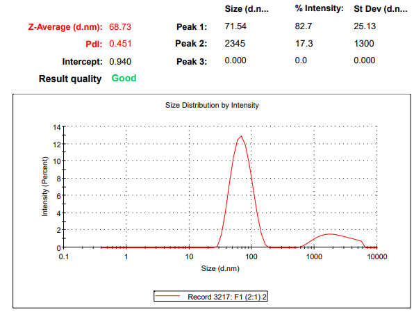Formulation was evaluated for globule size, PDI, zeta potential and were found to be 68.73±2.79 nm, 0.451±0.08 and-20.2±1.79 mV (fig. 2), respectively. Size of the formulation was showing nano-range, PDI was showing good uniformity and homogeneity between the particles, zeta potential was also showing stability of bilayer.