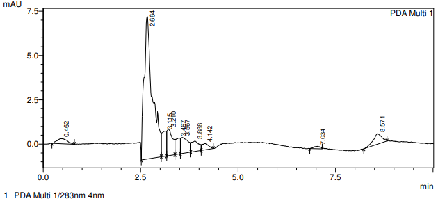 Methods: Optimized chromatographic condition was consisted of Acetonitrile (ACN) and 0.1% v/v formic acid in the ratio of 90:10 as a mobile phase in isocratic mode at 25±1 °C. In this C-18 (250 mm×4.6 mm, 5 µm) column was used and absorbance was recorded at 283 nm.