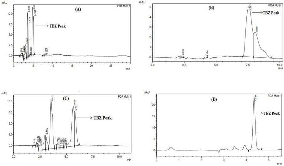 Fig. 4: Chromatogram of TBZ in ACN and 5 mmol ammonium acetate (A), Chromatogram of TBZ in ACN and 0.1% glacial acetic acid (B), Chromatogram of TBZ in ACN and 0.1% ortho-phosphoric acid (C), Optimized chromatogram of TBZ in ACN and 0.1% formic acid (90:10) (D)