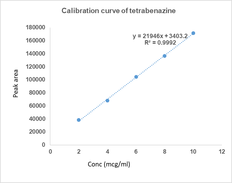 The range of an analytical method is the gap between the sample lowest and the highest concentrations of sample for which the analytical procedure has a satisfactory level of precision. Linearity was evaluated by analyzing a series of various concentrations of TBZ. Five concentrations (2, 4, 6, 8, 10 µg/ml) of TBZ were injected six times each, and the regression equation was noted.