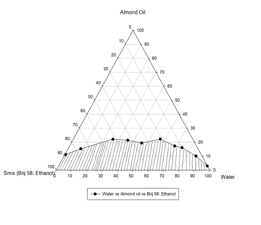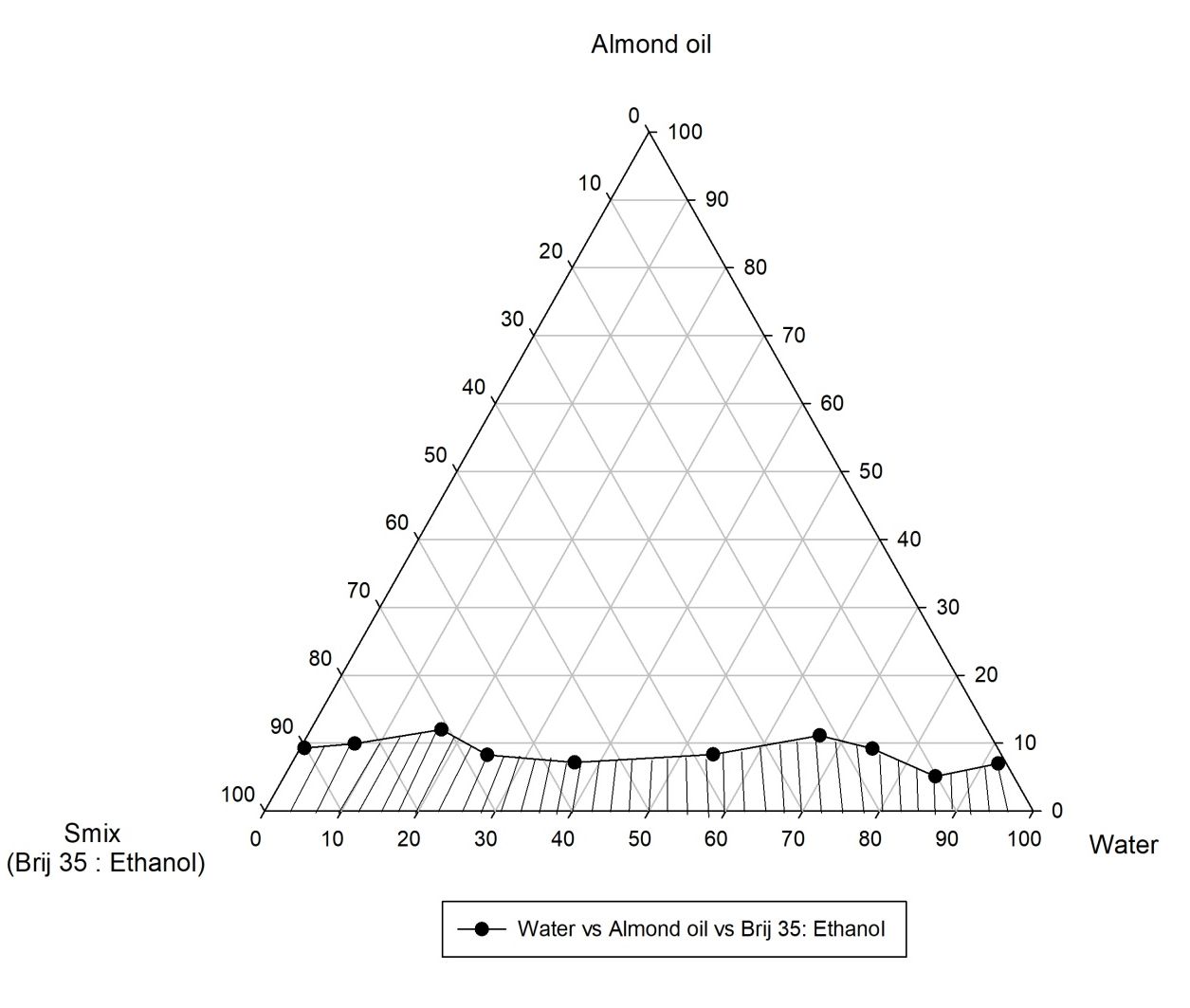 The pseudoternary phase diagrams were constructed using almond oil, Brij-35, Brij-58 and Brij-98, along with ethanol as a co-surfactant. The diagrams were pseudoternary when Brij-35, Brij-58 and Brij-98 is used along with a definite ratio of ethanol. The different ratios of Brij-35, Brij-58 and Brij-98, which are used along with ethanol for the study, are presented in table 1. The almond oil is mixed with different surfactant mixtures (SMIX) in weight ratios of 1:9, 2:8, 3:7, 4:6, 5:5, 6:4, 7:3, 8:2 and 9:1 [18]. The mixing is done with the aid of magnetic stirrer till a homogeneous mixing is accomplished. 5g of the mixture is withdrawn in a 500 ml beaker and water is added in 5% w/w increments of total mixture with continuous stirring at 30-40°C till the final mixture contains 95% w/w of water. The transparent to translucent regions were then identified and used for formulation development [19, 20]. The experiment has been performed in triplicate and good correlation has been observed in all the sets of experiments.
