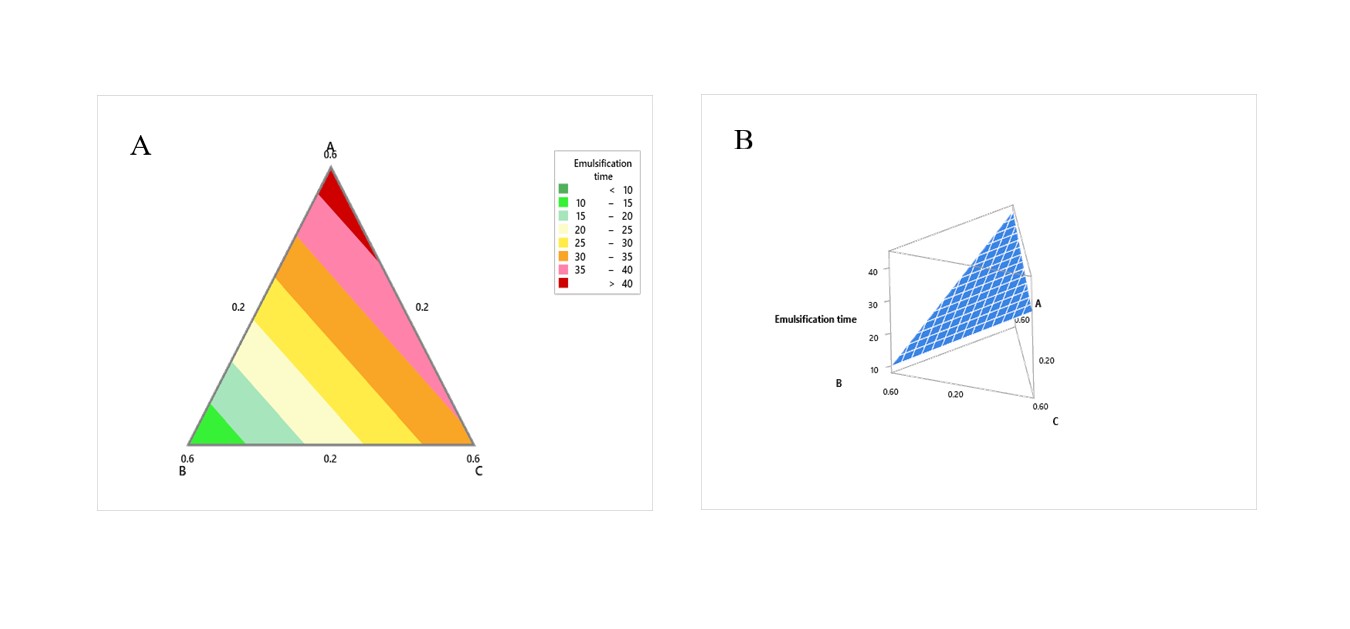 Fig. 4: A: Mixture contour plot of emulsification time, B: Mixture surface plot of emulsification time