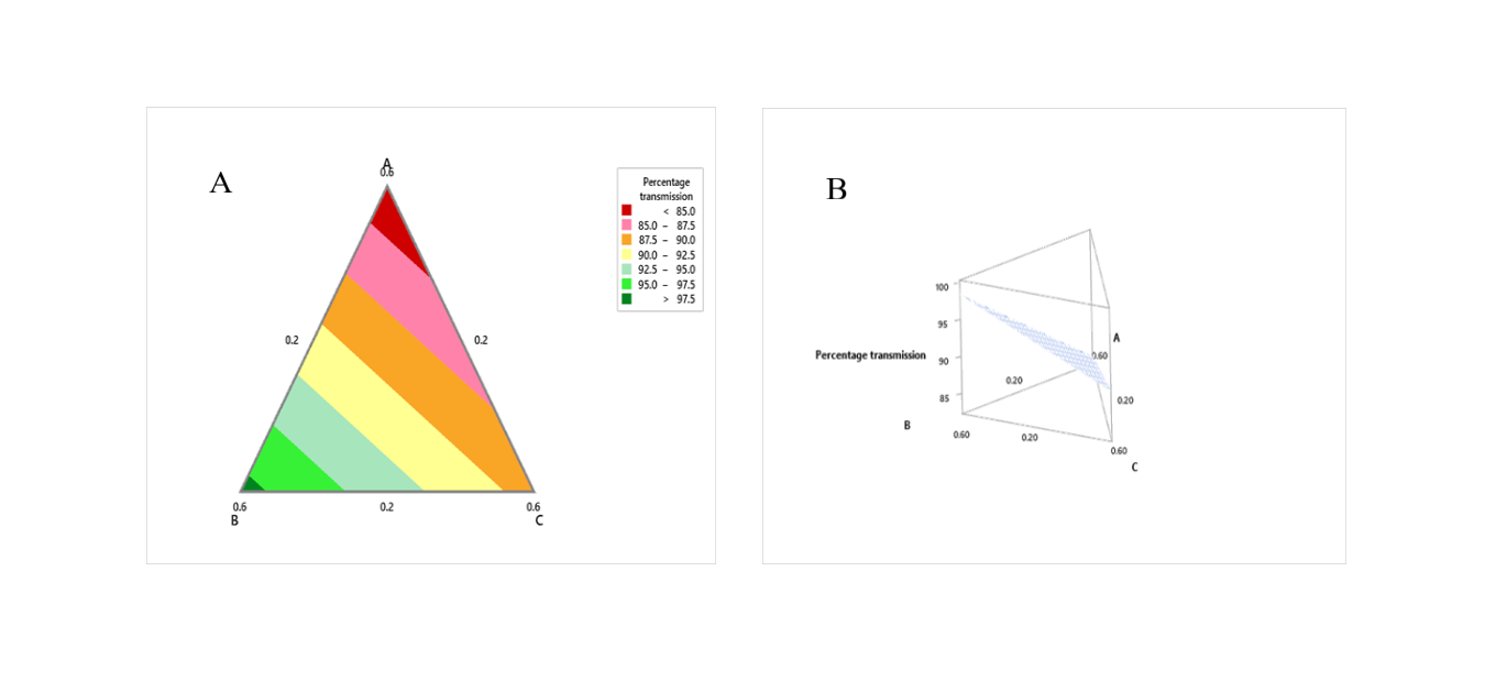 Fig. 5: A: Mixture contour plot of percentage transmission, B: Mixture surface plot of percentage transmission
