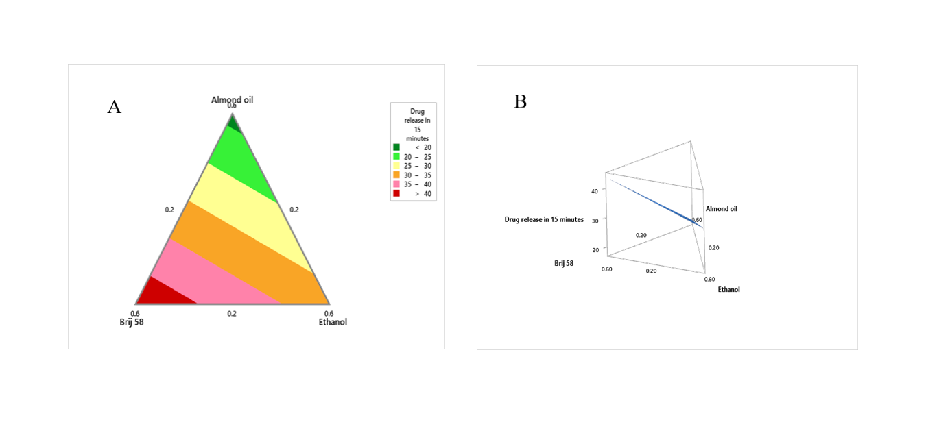 The emulsification time for prepared batches is shown in table 4. The data is analyzed by regression for mixtures at 95% confidence interval. ANOVA was applied to establish the correlation between emulsification time and excipients concentration. Emulsification time depends on relative proportions of almond oil, Brij-58 and ethanol. The mixture contour plot and mixture surface plot for emulsification time is presented in fig. 4 (A and B). The model fit summary is presented in table 5.