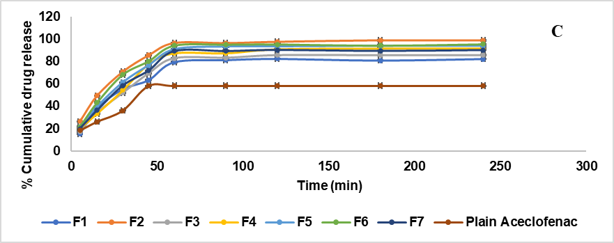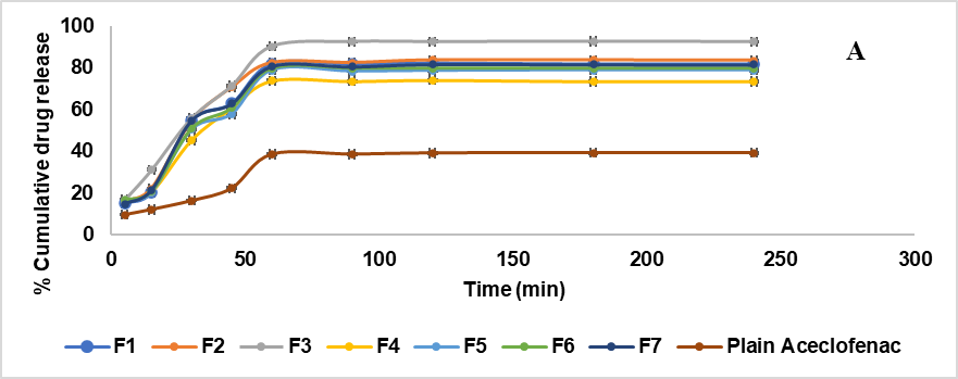 Fig. 11: (A) Percentage cumulative drug release of aceclofenac from the prepared formulations and plain drug in 0.1 M hydrochloric acid solution (pH 1.5); (B) Percentage cumulative drug release of aceclofenac from the prepared formulations and plain drug in acetate buffer solution (pH 4.5); (C) Percentage cumulative drug release of aceclofenac from the prepared formulations and plain drug in phosphate buffer solution (pH 6.8), (Data indicated as mean, n=3)
