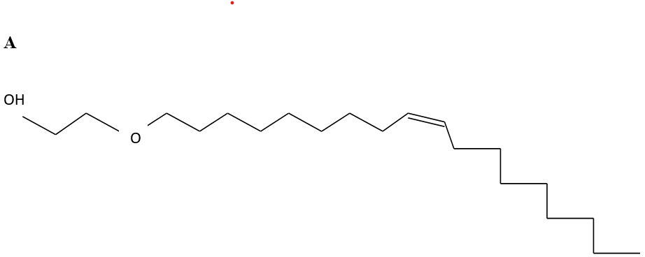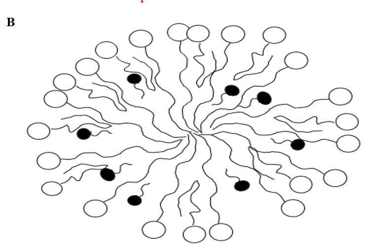 Fig. 12: (A) Structure of Brij 98; (B) Folding of Brij 58 and Brij 35 chains which provide better shielding to hydrophobic core (the filled black circles represents the ethanol molecules)