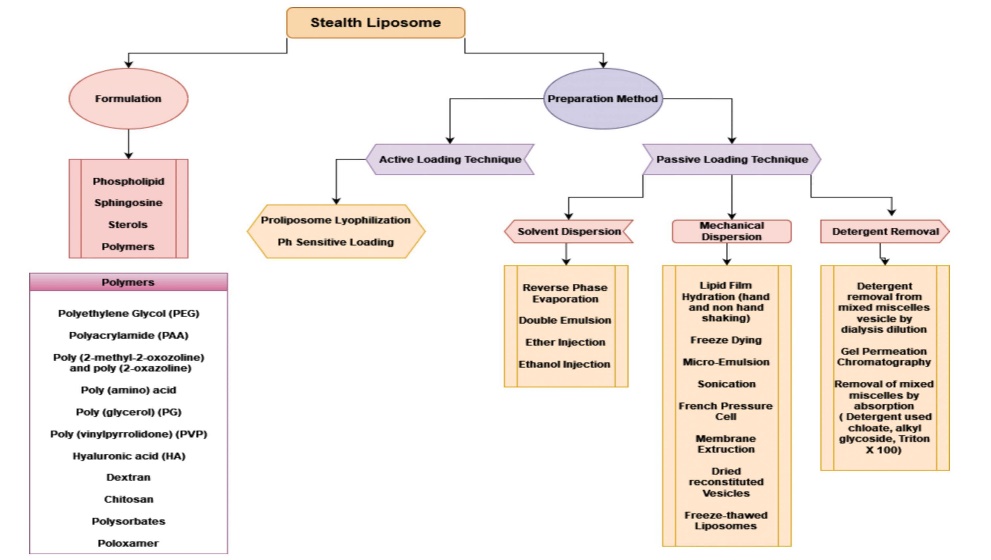There are various drug delivery techniques adopted for delivering cancer therapeutics for effective treatment outcomes. In this line, various drugs, vaccines, enzymes, proteins, and genetic materials are delivered in sustained action forms using conventional liposomes, which are microscopic in nature. The liposomes contain the molecular "payload," which eventually degrades spontaneously and releases its contents into the bloodstream or tissues by diffusing via capillary walls. When conventional liposomes are used for treatment, several drawbacks have been documented, including blood clearance, limited specificity, phagocytosis, opsonization low binding site, low bioavailability, low retention, and low effectiveness. The rapid Mononuclear Phagocyte System (MPS) absorption of typical liposomes upon systemic injection is a significant disadvantage. Therefore, new liposome generations known as stealth liposomes were developed to overcome the demerits of conventional liposomal delivery systems.