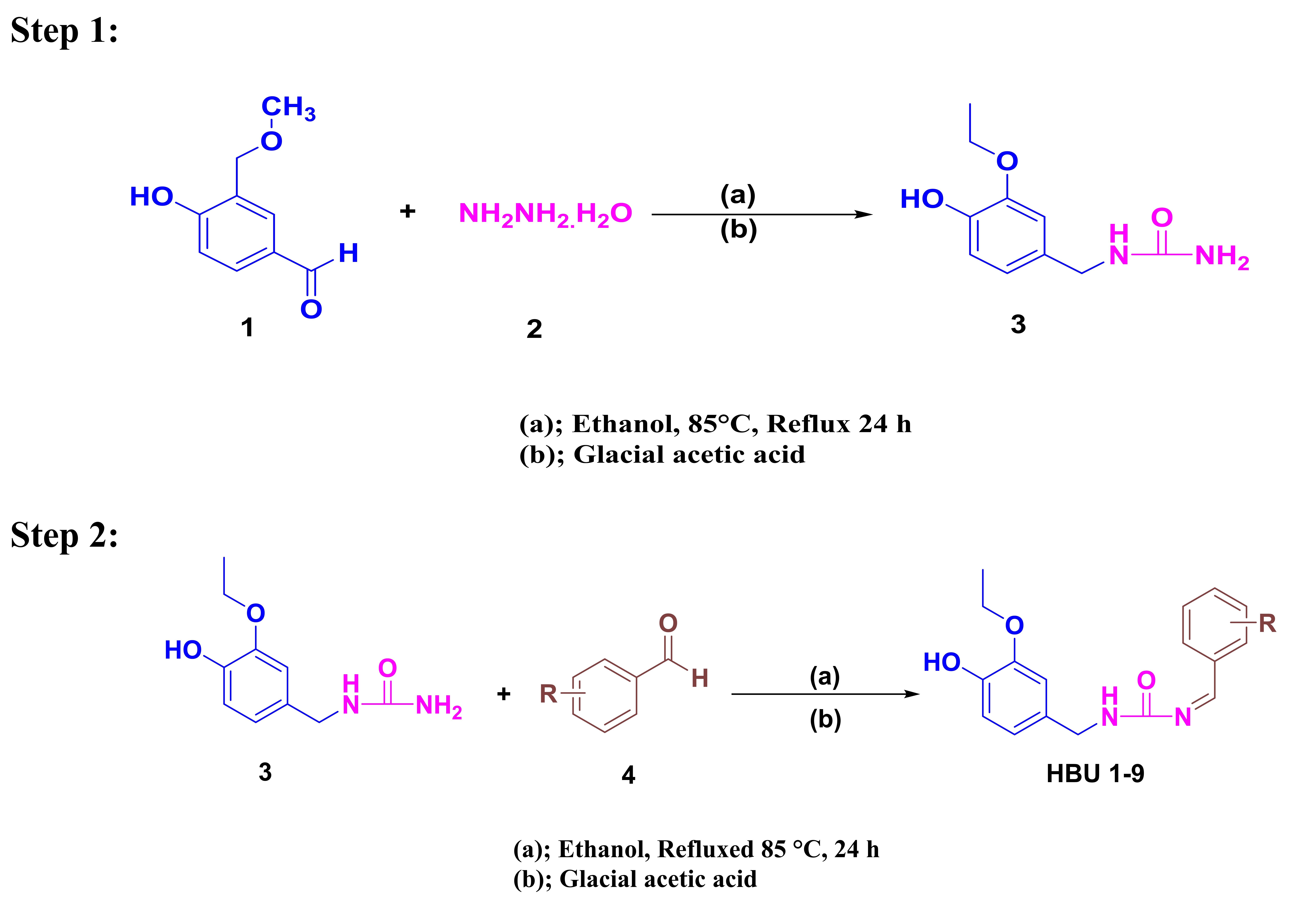 According to Step 1, the 4-hydroxy-3-(methoxymethyl) benzaldehyde (1) (0.05 mmol) was added to hydrazine hydrate (2) (0.05 mmol), in the presence of ethanol and a few drops of glacial acetic acid was refluxed at 80 °C for 24 h. The reaction condition was monitored using thin-layer chromatography in a solvent system of ethyl acetate and n-hexane (10%). The reaction mixture was precipitated at room temperature. The precipitates were filtered and recrystallized using ethanol and the desired compound 1-(3-ethoxy-4-hydroxybenzyl) urea (3) was obtained. In Step 2 the compound1-(3-ethoxy-4-hydroxybenzyl) urea (3) (0.05 mmol) was further treated with different aromatic substituted aldehydes (4) (0.05 mmol) in the presence of ethanol and glacial acetic acid, which was refluxed at 80 °C for 24 h. The reaction conditions were monitored using thin-layer chromatography. The precipitates were further filtered and dried at room temperature and the compounds HBU-1 to HBU-9 were obtained, as shown in fig. 6 [26-28].