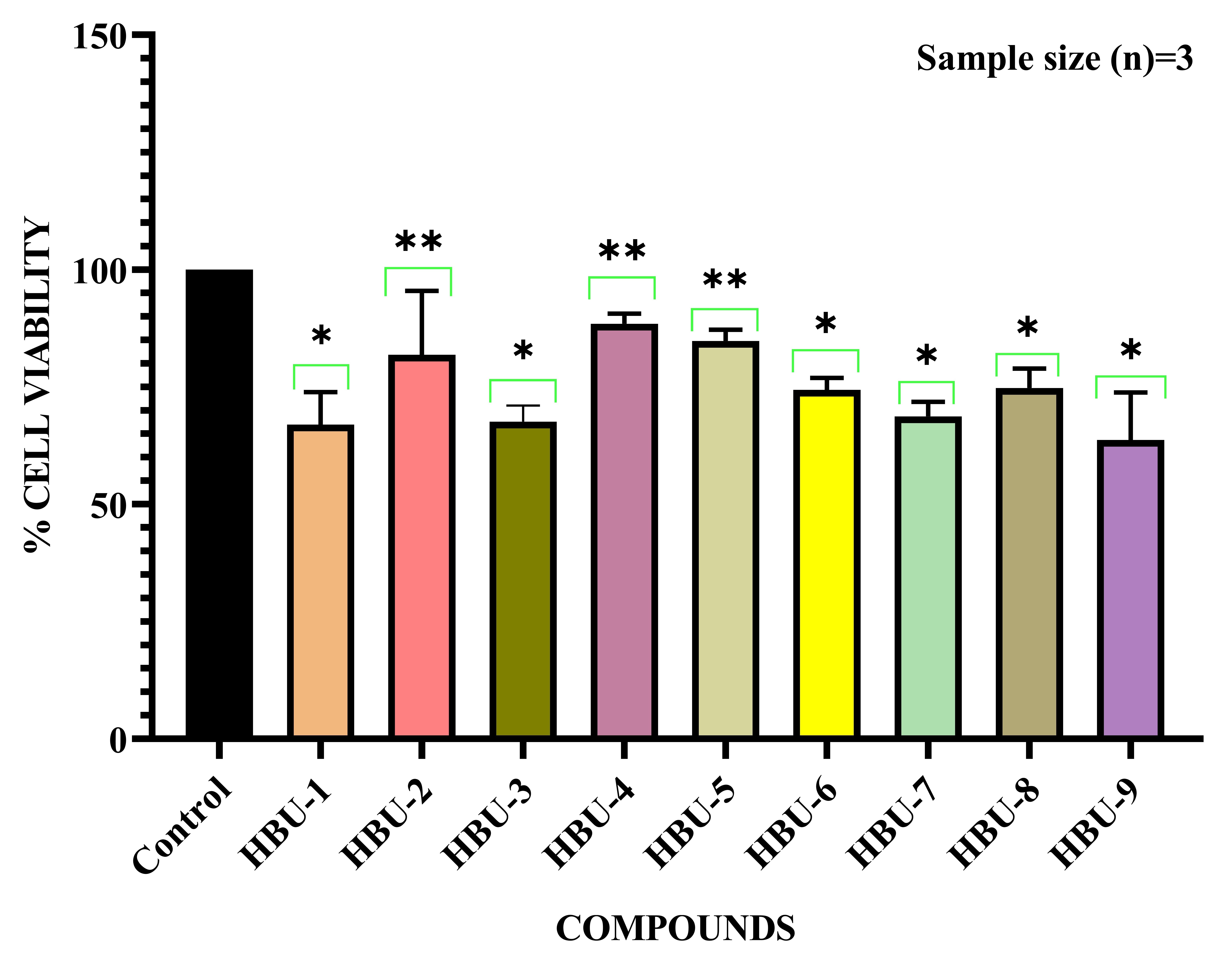 The SH-SY5Y neuroblastoma cell lines were used in the determination of the cytotoxicity of the synthesized compounds [29]. The cultured cell group and the control group (untreated) exhibited a % cell viability of 100%. The cell lines were treated in the sample concentrations of 500 µg/ml, 250 µg/ml, and 125 µg/ml to identify the toxicity dose of the synthesized compounds. The cytotoxicity studies were performed for all the synthesized compounds, whereas the compound HBU-2 exhibited a % cell viability of 66.26%, 88.05%, and 91.22% at a sample concentration of 500, 250, and 125 µg/ml. The lowest toxicity was observed at the minimal concentration of the sample at 125 µg/ml. Whereas the compound HBU-4 exhibited a % cell viability of 86.13, 88.76, and 90.42% at a sample concentration of 500, 250, and 125 µg/ml. The % of the total variation was found to be 94.40, indicating a p-value of 0.0145. The two-way ANOVA ordinary alpha value for HBU-1 was found to be 0.05. The 95% confidence interval (CI) value was obtained between 15.73 and 50.37, indicating a significance value less than 0.05, indicating a significant (*) value. The % of the total variation was found to be 98.51, indicating a p-value of 0.05. The two-way ANOVA ordinary alpha value for HBU-3 was found to be 0.05. The 95 % CI value was obtained between 23.85 and 40.98, indicating a significance value less than 0.05, indicating a significant (*) value. The % of the total variation was found to be 98.70, indicating a p-value of 0.04. The two-way ANOVA ordinary alpha value for HBU-6 was found to be 0.05. The 95 % CI value was obtained between 19.30 and 31.95, indicating a significance value less than 0.05, indicating a significant (*) value. The % of the total variation was found to be 98.00, indicating a p-value of 0.03. The two-way ANOVA ordinary alpha value for HBU-7 was found to be 0.05. The 95 % CI value was obtained between 23.69 and 38.85, indicating a significance value less than 0.05, indicating a significant (*) value. The % of the total variation was found to be 98.00, indicating a p-value of 0.05. The two-way ANOVA ordinary alpha value for HBU-8 was found to be 0.05. The 95 % CI value was obtained between 14.99 and 35.41, indicating a significance value less than 0.05, indicating a significant (*) value. The % of the total variation was found to be 98.00, indicating a p-value of 0.02. The two-way ANOVA ordinary alpha value for HBU-8 was found to be 0.05. The 95 % CI value was obtained between 11.18 and 61.38, indicating a significance value less than 0.05, indicating a significant (*) value. The hypothesis proposed a major significance (*) p-value, where the variables were found to fail the null hypothesis, and all the variables were statistically found to be significant [30, 31]. The two-way ANOVA ordinary alpha value for HBU-2 was found to be 0.05. The 95 % CI value was obtained between 32.04 and 50.06, indicating a significance value of less than 0.004, indicating a significant (**) value. The two-way ANOVA ordinary alpha value for HBU-4 was found to be 0.05. The 95 % CI value was obtained between 29.07 and 40.88, indicating a significance value of less than 0.003, indicating a significant (**) value, as shown in fig. 7.