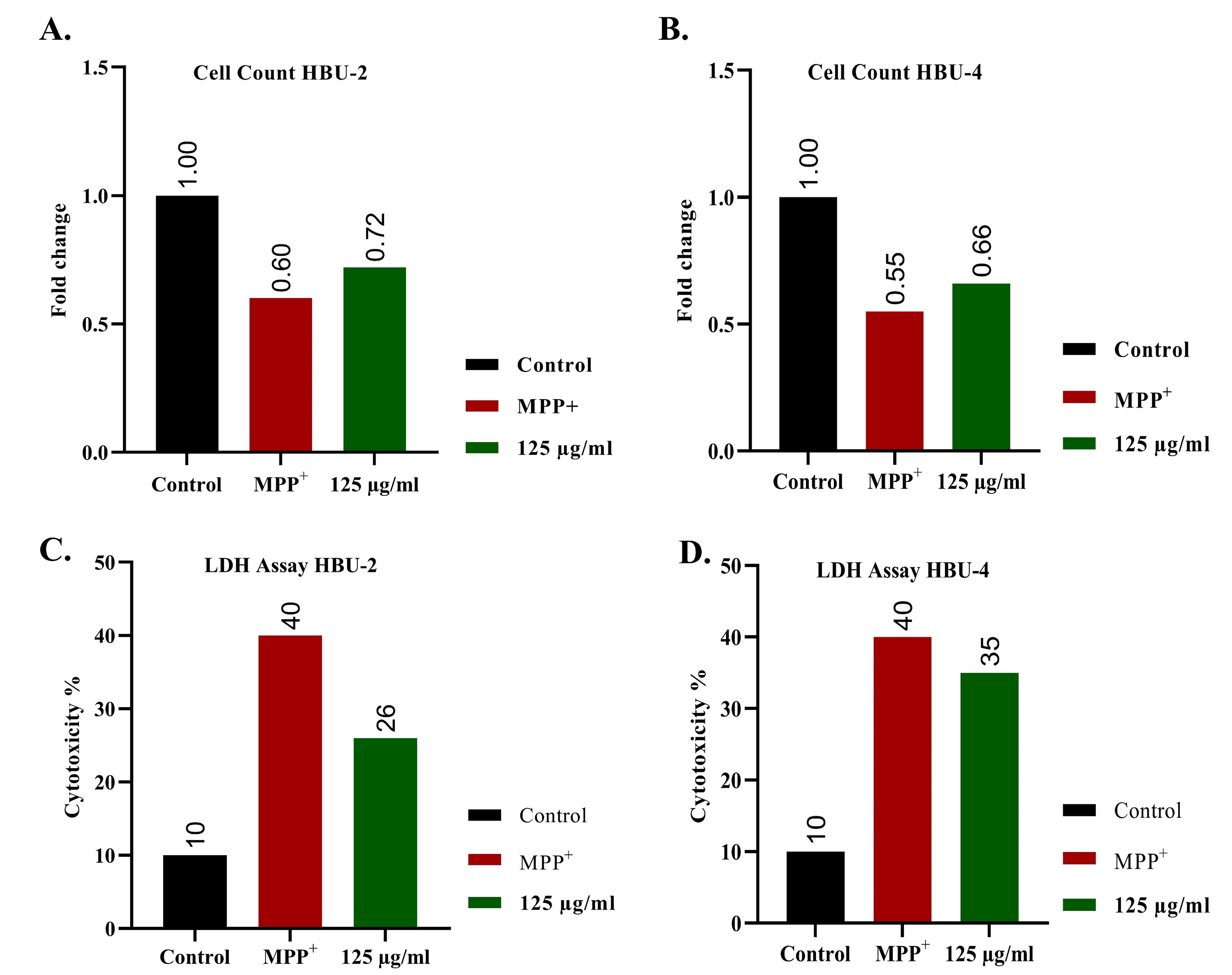 Fig. 8: The synthesized compounds were studied for neurotoxicity via the cell count and LDH assay. A. The control (untreated cells) was found to exhibit no decrease in the cell count, whereas the induced MPP+ showed a decrease in cell count to 0.60-fold change, and the treatment group HBU-2 at 125 µg/ml increased the cell count to 0.72-fold change. B. The control (untreated cells) was found to exhibit no decrease in the cell count, whereas the induced MPP+ showed a decrease in cell count to 0.55-fold change, and the treatment group at 125 µg/ml increased the cell count to 0.66-fold change. C. The LDH assay in the control (untreated) group exhibited no cytotoxicity. In contrast, at inducing MPP+, 40 % of the cytotoxicity was observed, and after treating it with the HBU-2 the LDH level was reduced to 26% at 125 µg/ml. D. The LDH assay in the control (untreated) group exhibited no cytotoxicity, whereas at inducing MPP+40 % of the cytotoxicity was observed, and after treating it with the HBU-4 the LDH level was reduced to 35 % at 125 µg/ml
