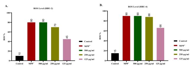 Fig. 9: ROS Level study compared to the HBU-2, and HBU-4 compounds. A. The ROS % in the control group was found to be 10 %, where the MPP+ continuously increased the ROS % up to 80 %; by treating the cells at 125 µg/ml the ROS % was found to be decreased to 45 % by the compound HBU-2. B. The ROS % in the control group was found to be 10 %, where the MPP+continuously increased the ROS % up to 80 %, by treating the cells at 125 µg/ml the ROS % was found to be decreased to 66 % by the compound HBU-4