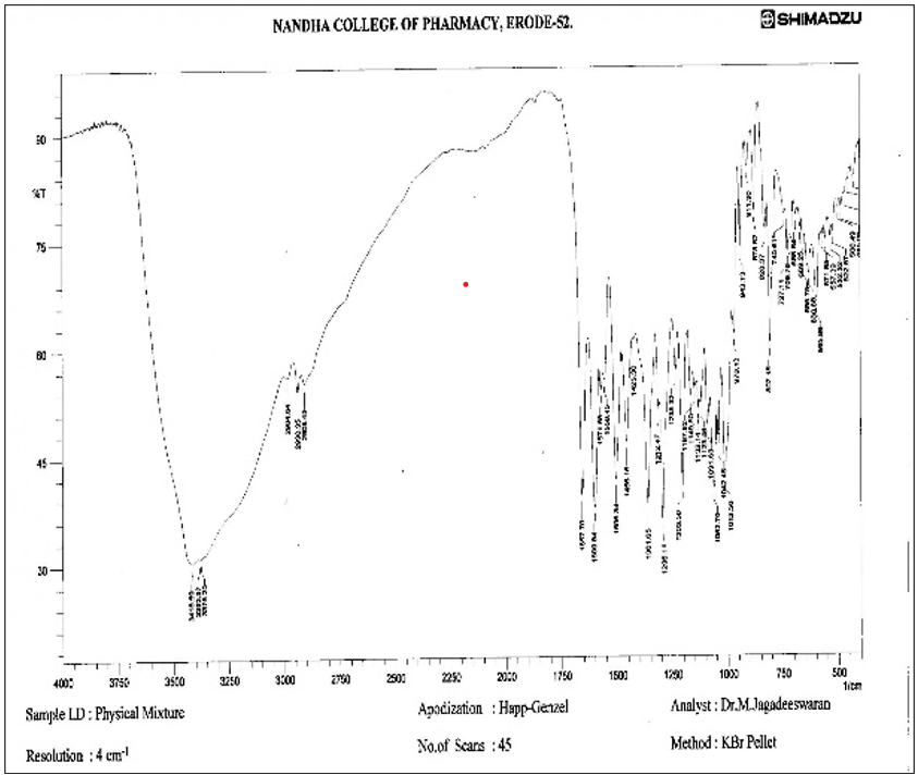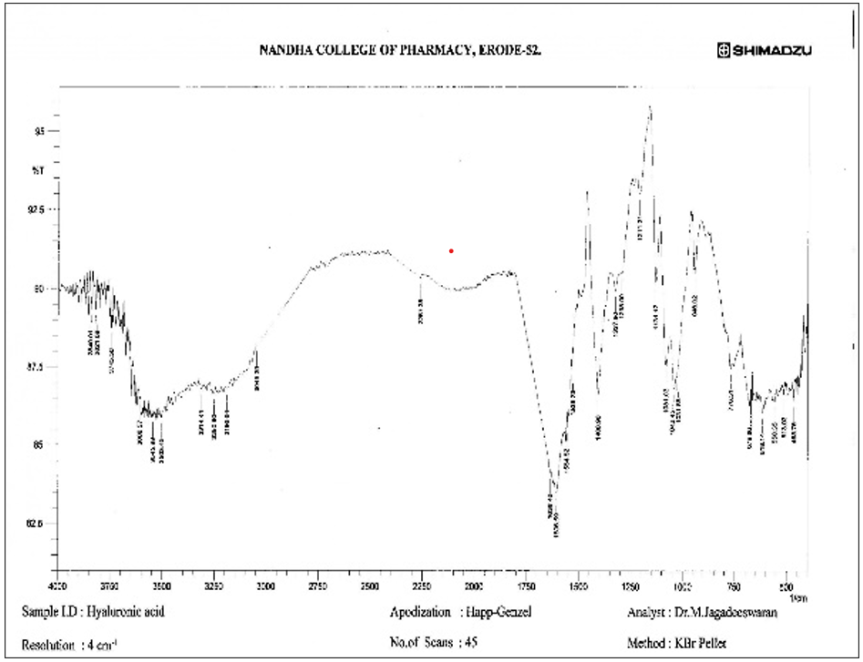 In this study, Fourier-Transform Infrared Spectroscopy (FTIR) analysis was employed to investigate potential interactions among rutin, soya lecithin, chitosan, and HA present in the formulation. The analysis was conducted across a wavelength range from 400 cm-1 to 4000 cm-1, aiming to discern any observable interactions between these components [12].