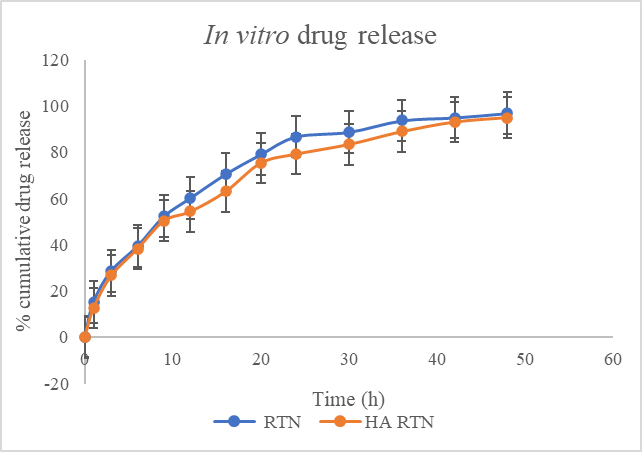 In vitro study provided valuable understanding into the behaviour of HA RTN. As illustrated in fig. 12, the cumulative release from RTN and HA RTN exhibited a prolonged release pattern over time. The optimized batch RTN and HA RTN drug release profile demonstrated a significant increase from an initial content of 15.36±1.47% to final concentration of 96.73±1.01% and 12.61±1.60% to a final content of 94.95±2.43% respectively. This observed gradual release can be attributed to the effective diffusion of the drug through the lipid core of the nanoparticles [33, 34].