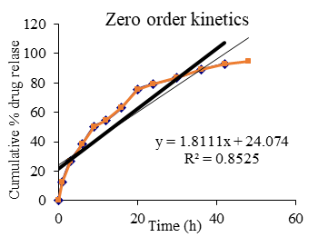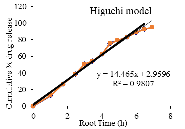 The analysis of the data involved the application of various models, including zero-order, first-order, the Higuchi model and the Korsmeyer-Peppas model. The optimized batch, Higuchi's model exhibited the highest correlation coefficient (R2=0.9807), followed by the Korsmayer Peppas model (0.9781), first-order (R2=0.9756), Hixon Crowell model (0.9745) and zero-order (R2=0.8525) models, as illustrated in the (table 3) (fig. 13-17).