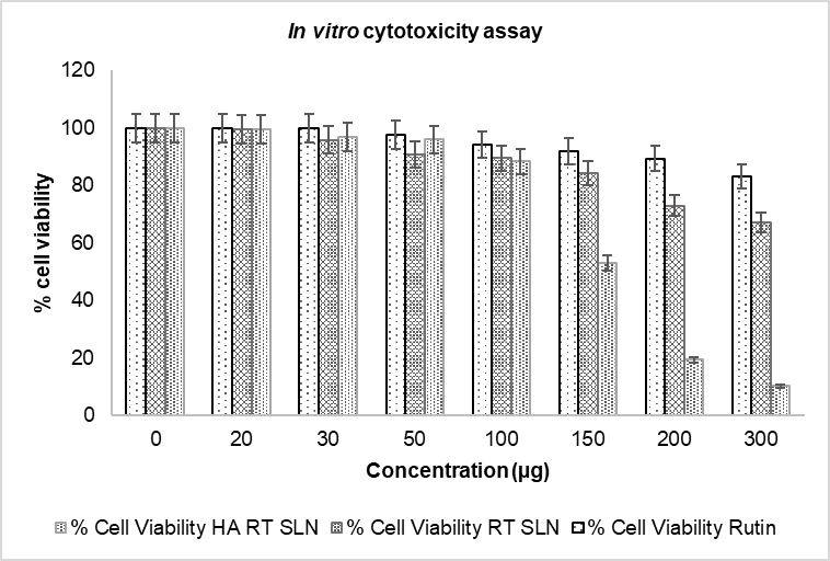 The study investigated the cytotoxicity effects and safety of rutin, RTN and HA RTN using an in vitro (3-[4,5-dimethylthiazol-2-yl]-2,5 diphenyl tetrazolium bromide) (MTT) assay. For in vitro cytotoxicity assessment, Michigan Cancer Foundation-7 (MCF-7) Cells (1×104) were seeded in individual wells of a 96‐well plate and incubated for 48 h under 5% CO2 at 37 °C. Subsequently, the cells were exposed to varying concentrations (20, 30, 50, 100, 150, 200, and 300 µg/ml) of pure rutin, RTN and HA RTN for a duration of 72 h. When cells reached 70% confluence, MTT reagent (10μL, at a final concentration of 0.5 mg/ml) was introduced into each well and incubated for 4 h. Afterwards, acidified isopropanol, serving as the MTT destaining solution (100 μl), was added and the solution was agitated for 15 min [23-25]. Ultimately, the determination of optical density at the 570 nm wavelength was conducted using a microplate reader.