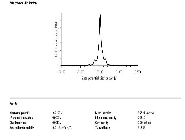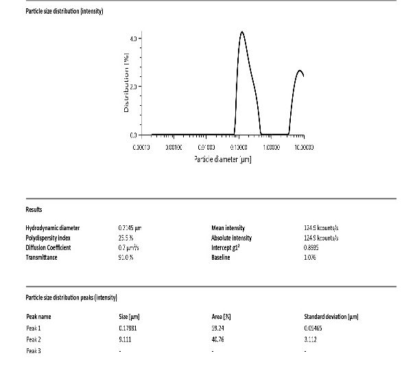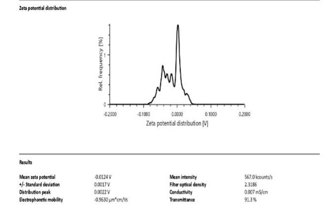 The PS of RTN and HA RTN were determined to be 202.8 nm and 714 nm, respectively (fig. 6,8). The PDI values were 26.4% and 25.5% for RTN and HA RTN, indicating a narrow distribution width and confirming a uniform PS distribution, demonstrating high dispersion quality. ZP measurement is crucial for predicting the storage stability of colloidal particles, as charged particles are less prone to aggregation. The measured ZP were-0.0124V and-0.003V, indicating a negative charge on the particle surface (fig. 7,9). The combination of low PDI values and slightly negative ZP suggests that the chosen method for preparing nanoparticle, along with the incorporation of HA coating, was well-suited for the formulation of these nanoparticles [31, 32].