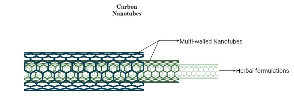 Carbon nanotubes are sheets of graphite rolled up that are tubular and needle-shaped. They can be used as carriers for various proteins, genes, and drugs. They are classified as Single-Walled Carbon Nanotubes and Multi-Walled Carbon Nanotubes [12]. The carbon in the carbon nanotubes shows sp2 hybridization. It is known to have high tensile strength, high surface area, large aspect ratios, elastic in nature, flexibility, and good mechanical strength. The synthesis of CNTs requires vacuum condition, and the methods used for synthesis are, Chemical Vapour Deposition, laser ablation method, plasma-enhanced CVD, Thermal synthesis process, and, discharge method, these methods are known to produce an enormous amount of CNTs [13].
