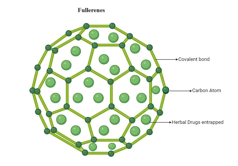 Fullerenes are football-like shaped and made of 60 carbon atoms (20 hexagons with C5-C6 double bonds, 12 pentagons with C5-C5 single bonds) [15]. They consist of fused rings and conjugated bonds with sp2 and sp3 bond hybridization, with the average bond length of the single bond being 0.145 nm and the average bond length of the double bond being 0.141 nm. They are 1-10 nm in diameter, having a cage-like structure. It aids in the solubility and bioavailability of the drug which is entrapped in the cage [16].